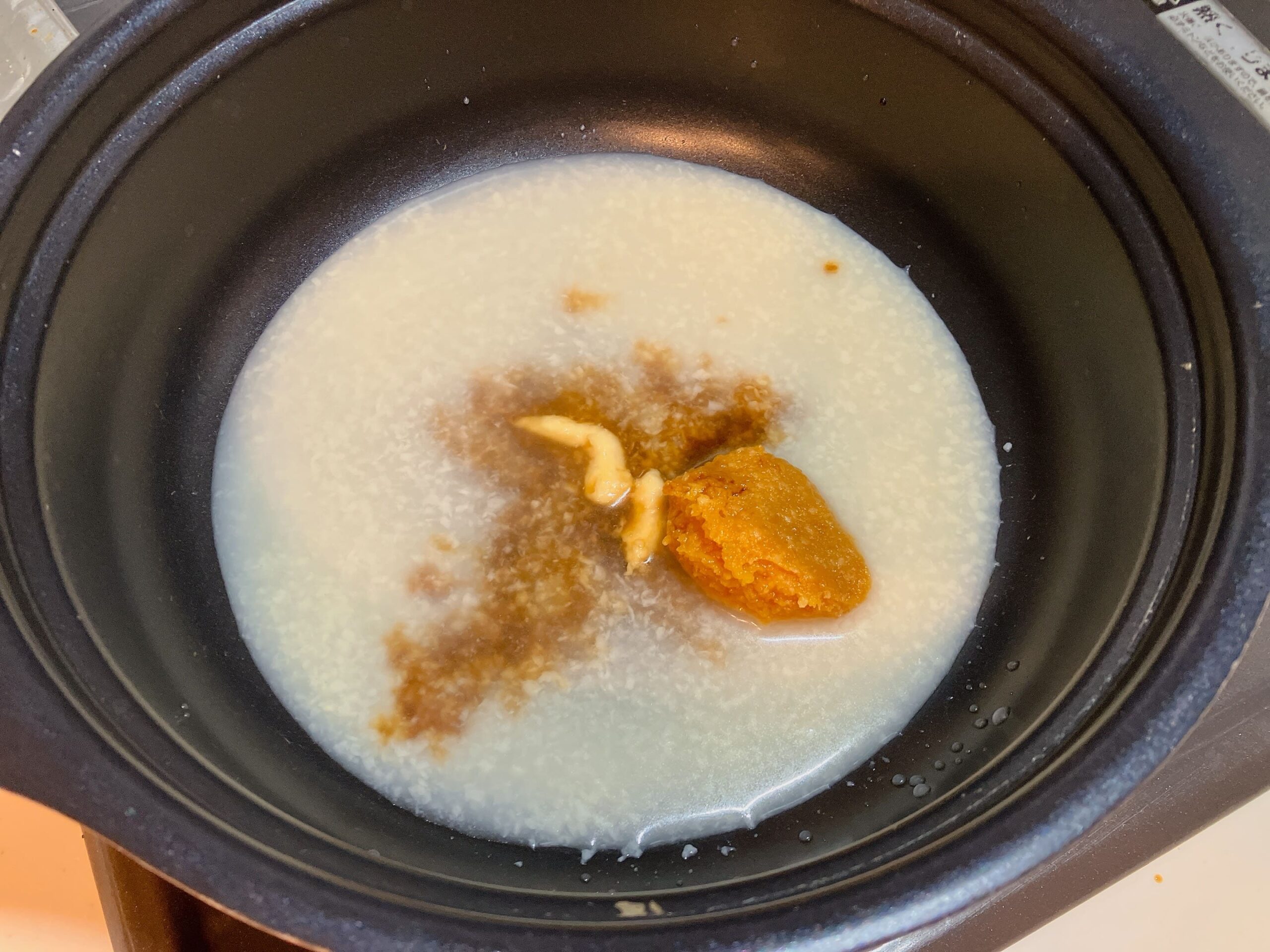 ⑥鍋に甘酒(100㏄)、みそ(大さじ1)、しょうゆ(大さじ1)、すりおろした生姜(1かけ)を入れてよく混ぜる。