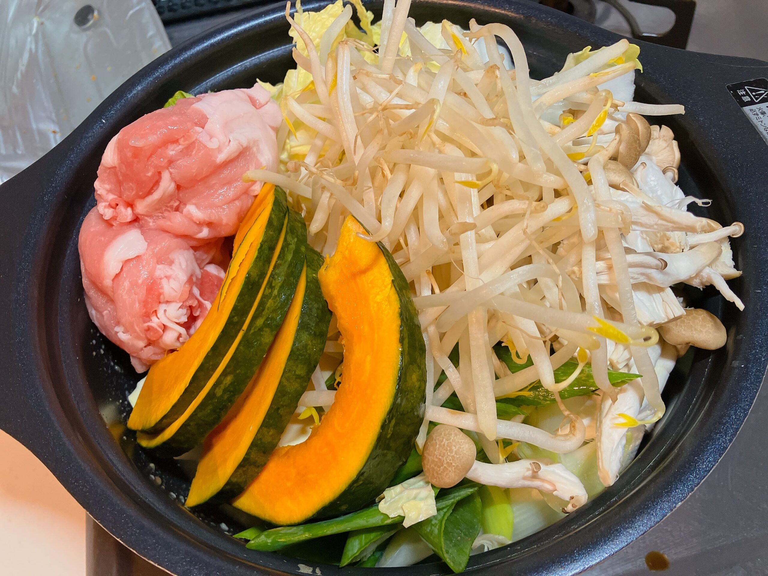 ⑦切った具材を全て鍋に入れ、さらにもやし(1/2袋)を入れてフタをして中火で約10分煮込む。