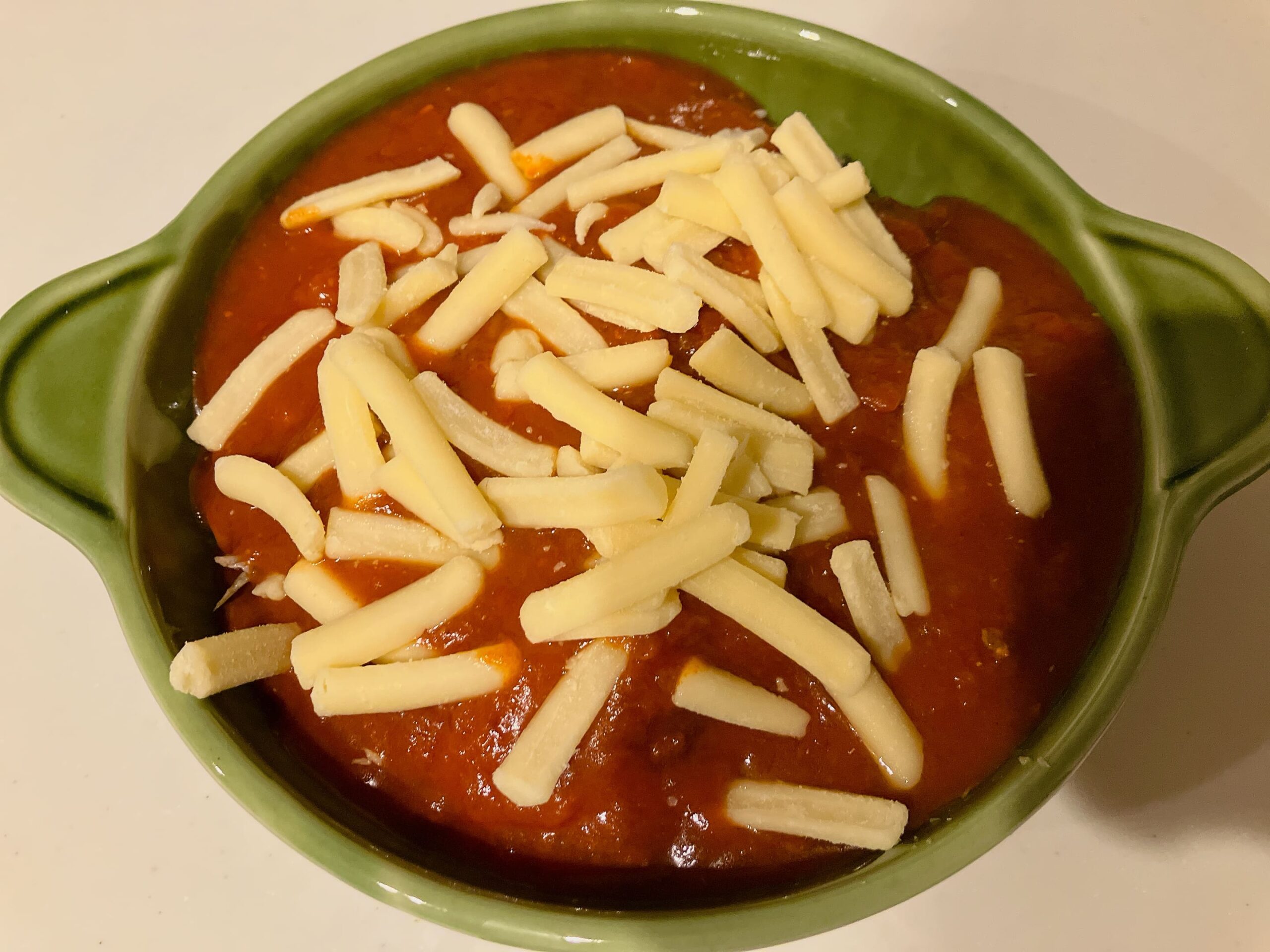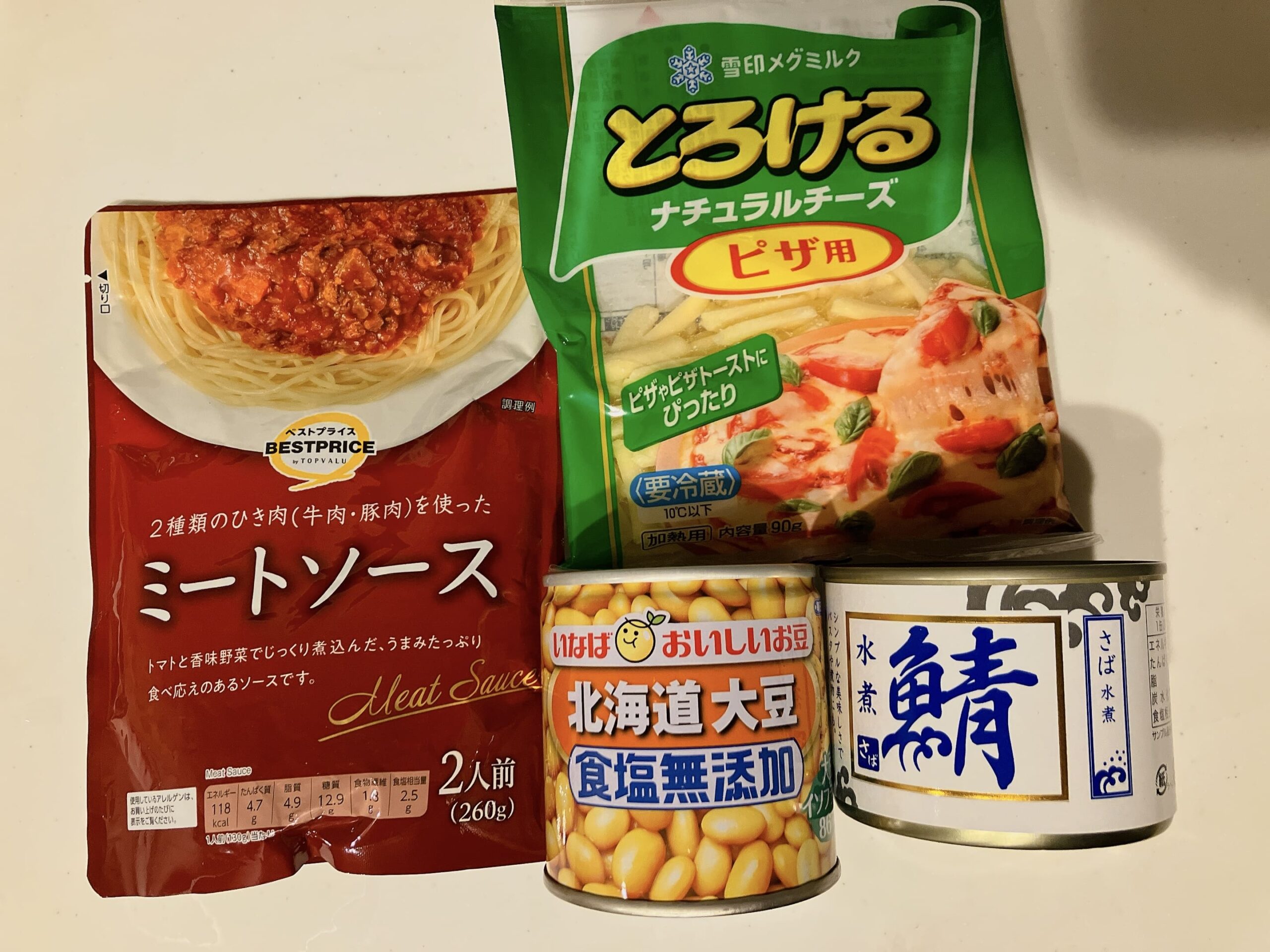 ①大豆缶(1缶)とサバの水煮缶を耐熱皿に出し、上からレトルトミートソースとピザ用チーズをかける。